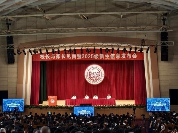18岁的女儿成了他的校友。这一天,可容纳3000多人的礼堂座无虚席,还有人坐在台阶上。家长从全国各地而来,现场很安静,少有人交头接耳,舞台上拉着“校长与家长见面暨2025级新生信息发布会”的条幅。校长和各部门负责人介绍学校的教学、科研、升学、就业、后勤情况。