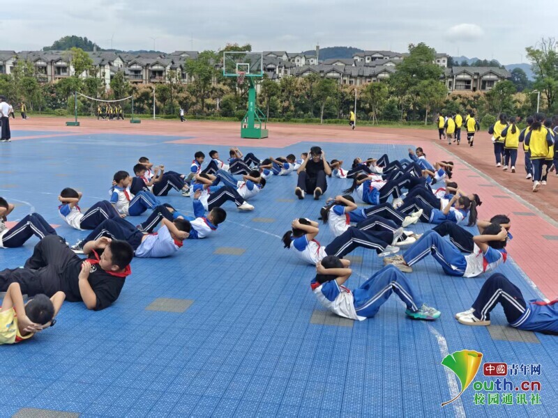 图为体育课张东旭带四(2)班学生练习仰卧起坐。王小倩 供图