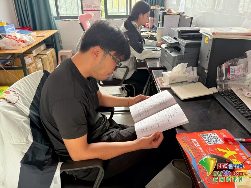 图为张东旭翻看以前写的数学教案,怀念那段在四(2)班上数学课的时光。杨丝丝 供图