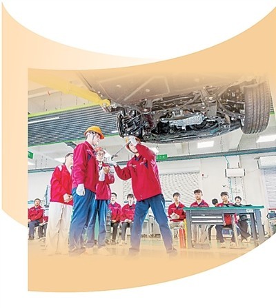 山东水利技师学院实训中心,学生正进行整车维修和保养操作。