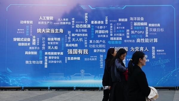 第十九届“挑战杯”现场,由人工智能、新质生产力、量子科技等关键词构成的主题墙。雷乾昊/摄