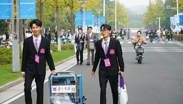 参赛学生正运送展示物料前往比赛主场馆。雷乾昊/摄