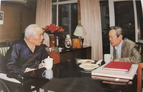 南开大学教授葛墨林在陈省身先生寓所向杨振宁汇报理论物理研究所工作情况。南开大学供图