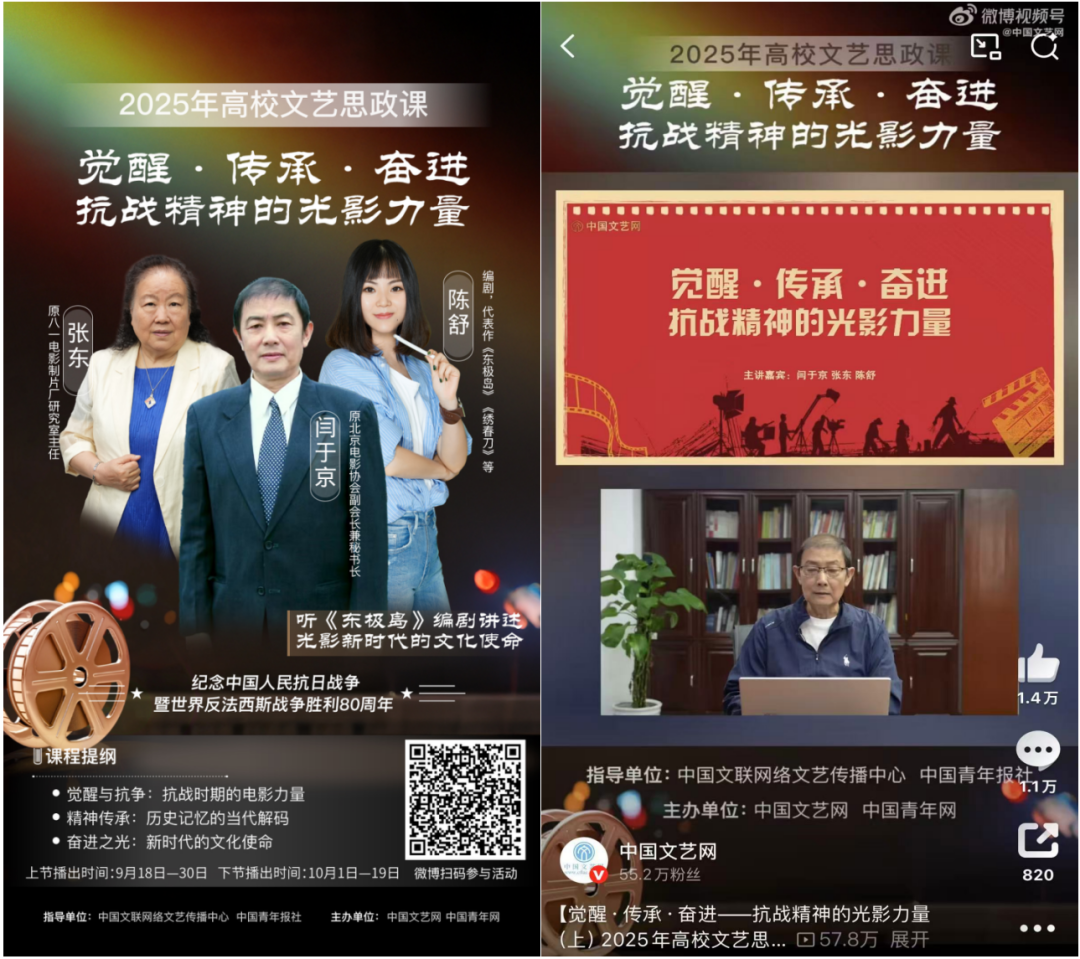 《觉醒·传承·奋进——抗战精神的光影力量》视频课程,选取了抗战时期、新中国成立后及新时代三个历史阶段的多部代表性经典影片(包括《风云儿女》《地道战》《东极岛》等),并对其进行深度解读与赏析。闫于京、张东及陈舒分别从时代背景、创作历程、艺术手法等维度,剖析这些文艺作品所蕴含的民族精神。