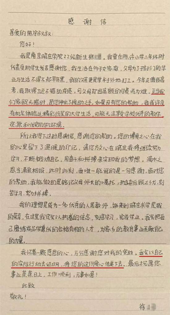 得知了“警察叔叔”的真实身份后,为了向他表达谢意,徐同学与其他同学们取得了联系,并代表大家的心意,认真地手写了一封感谢信。信中,孩子们表示:“我怀着一颗感恩的心,万分感谢您对我的资助。我会以自己的实际行动去证明,将您的这份爱心传递下去……”(刘林 王尚杰)
