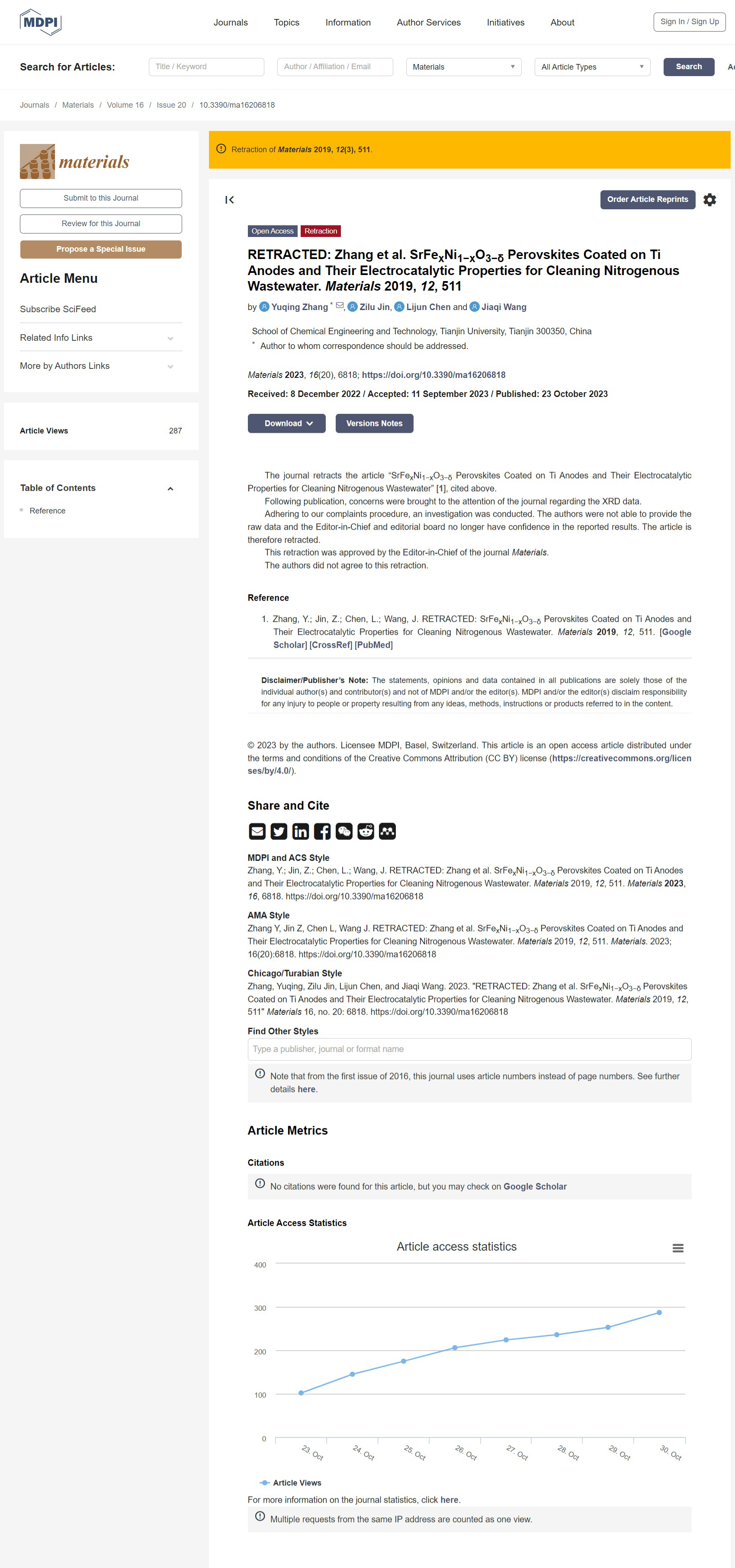 澎湃新闻记者注意到,本月稍早前,原张裕卿团队于2019年2月8日在期刊“Materials”在线发表题为“SrFexNi1-xO3-δ Perovskites Coated on Ti Anodes and Their Electrocatalytic Properties for Cleaning Nitrogenous Wastewater”的文章被该期刊撤回。原因为数据异常,编辑部表示,根据投诉程序,对文章进行了调查。作者无法提供原始数据,主编和编委会对报告的结果不再有信心,因此被撤回。此次撤稿已得到Materials 总编辑的批准。作者不同意这次撤稿。