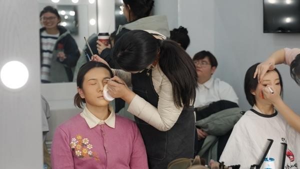 宿州学院表演专业(泗州戏方向)的学生在进行演出前的化妆。 图片由宿州学院提供