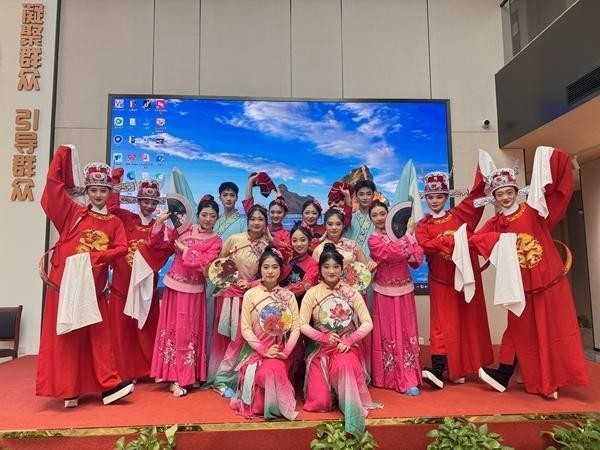 凤阳花鼓非遗传承人孙凤城、高静与滁州学院花鼓艺术团的学生同台演出。 图片由滁州学院提供