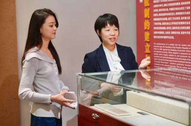 “百所高校校博联展计划”走进江西财经大学税收票证博物馆。图为江西财经大学财政税务学院副院长、副教授戴丽华向主持人介绍展品。中青报·中青网记者 梅从政摄