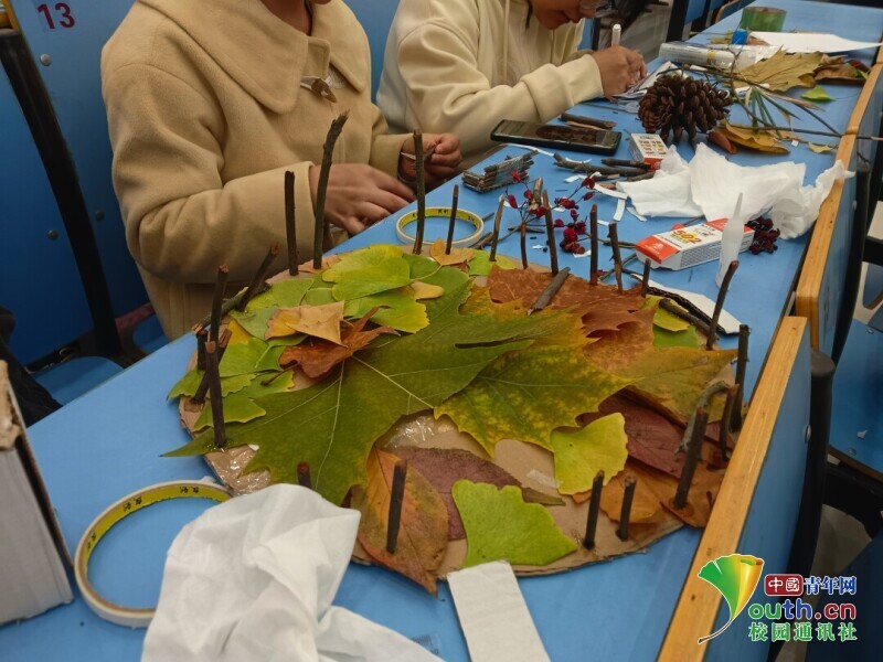 来自生物科学专业的一组参赛选手,并没有急于动手粘贴,而是对着手中的几片残叶反复比对纹理。该组成员表示,他们试图利用叶片自然的枯黄渐变色,来表现土地从沙化到植被复苏的过程。“专业课上我们更多是分析,而今天是用手去触摸这些‘生物量’。同样是一片落叶,被当作垃圾丢弃和被当作艺术品重构,结果完全不同。参与这次比赛,让我们对‘变废为宝’和循环利用有了更感性的认知。”该同学一边小心翼翼地修剪一片银杏叶的边缘,一边感慨道。