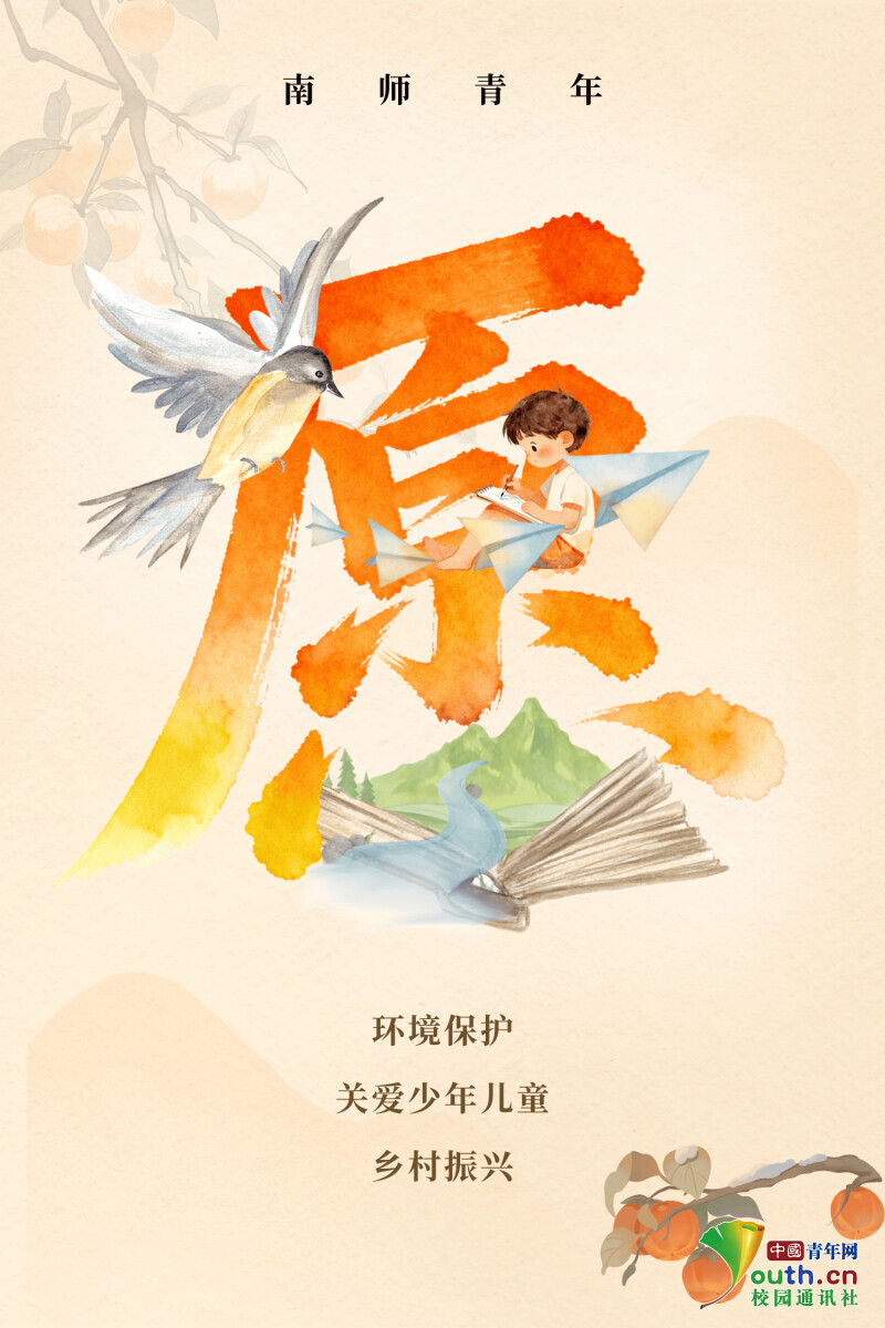 图为创意字“愿”。飞鸟展翅,翱翔在“环境保护”中的美好蓝天。飞向少年的纸飞机象征着“关爱少年儿童”的呵护行动。书本托举中的乡村山水,诠释教育赋能“乡村振兴”的生动图景。孙敏哲 武艺霏 吴心乐 供图