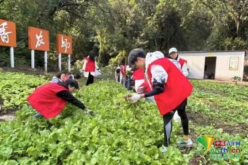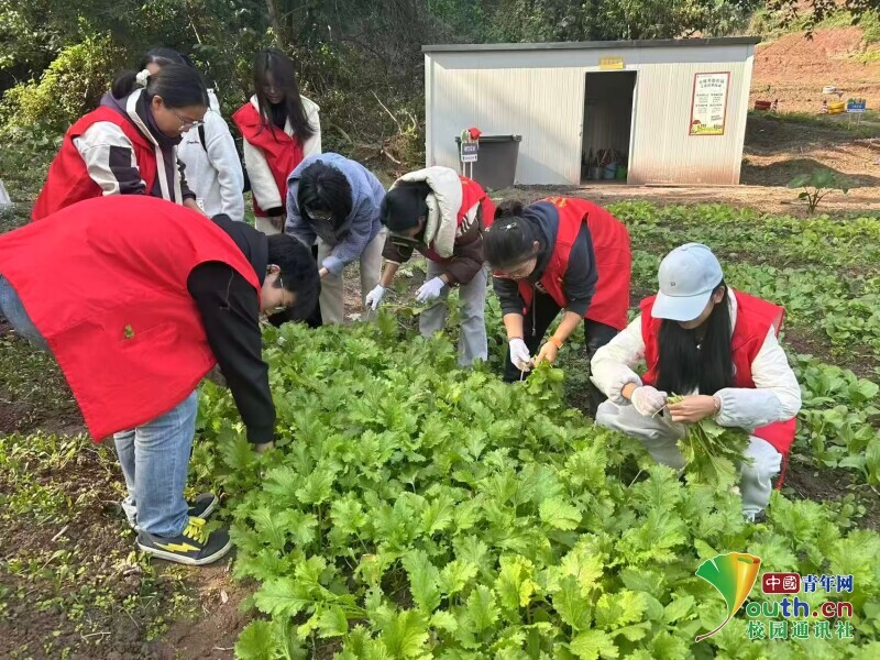 重庆理工大学学生在士继书香农场开展蔬菜采收实践。洪俞婷 供图