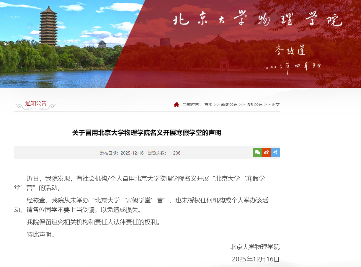 12月16日,北京大学物理学院网站发布“关于冒用北京大学物理学院名义开展寒假学堂的声明”: