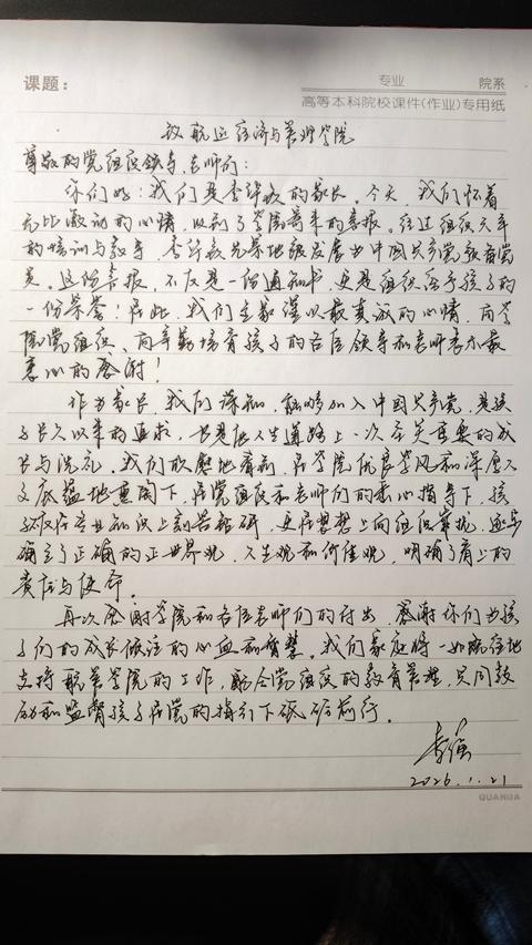 学生党员李华钦的父亲在给学院党委的信中写道:“作为家长,我们深知能够加入中国共产党,是孩子长久以来的追求,更是他人生道路上一次至关重要的成长与蜕变。我们欣慰地看到,在学院优良学风和浓厚文化氛围的熏陶下,在党组织和老师们的悉心指导下,孩子不仅在专业知识上刻苦钻研,在思想上也不断进步,树立了正确的世界观、人生观、价值观,明确了自己的责任与使命。感谢你们为孩子倾注的心血!”