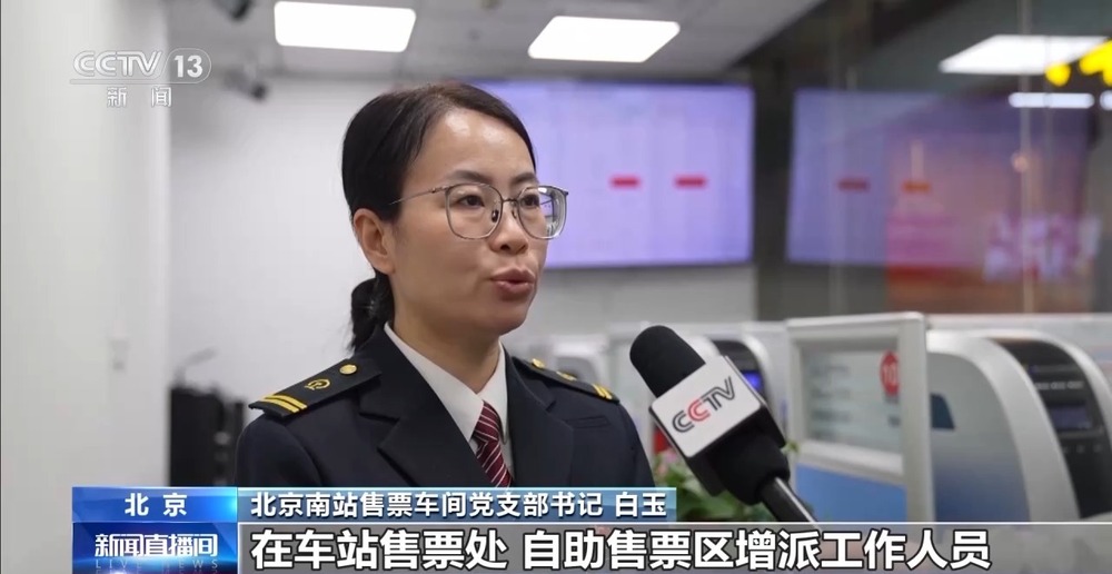 北京南站售票车间党支部书记 白玉:车站在售票处、自动售票区都增派了工作人员,重点解答学生旅客票优惠票使用、资质核验、改签退票等规定,帮助学生旅客快速办票、不耽误乘车。