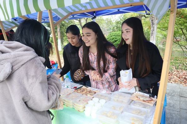 市集现场人气鼎沸,特色摊位成为最大亮点。10个留学生专属摊位带来异国手作、特色小食与文化周边,打造中外学子沉浸式交流的鲜活窗口,异国风情扑面而来;41个校内学生创业摊位涵盖文创、特产、手作、日用好物等品类,尽显青年学子的创新思维与商业潜力;3个社企共建摊位+1个校友企业摊位,打通校园与社会资源链路,推动创业实践、校地合作、校友联动融合,绘就多方共赢的生动图景。