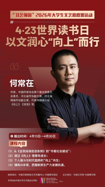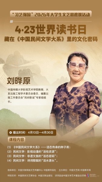 本次活动由中国文联网络文艺传播中心、中国青年报社共同指导,中国文艺网、中国青年网联合主办,面向全国高校大学生开放。此次上新的两门课程分别为《423世界读书日·以文润心“向上”而行》与《423世界读书日·藏在〈中国民间文学大系〉里的文化密码》,课程将通过中国文艺网哔哩哔哩(B站)官方账号持续播出至4月30日,为青年学子送上丰富的精神食粮。