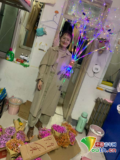 图为出摊前张小文在宿舍准备鲜花和气球。本人提供
